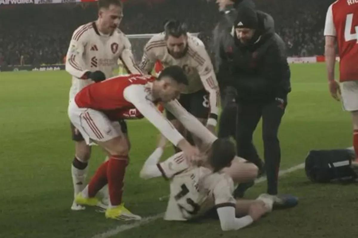 据现场细节显示,布拉德利在成功避开一次险情后,试图将球踢向安全区域,却在完成动作后失去平衡,膝盖以尴尬的角度着地,随后痛苦倒地无法起身。当布拉德利倒地接受治疗时,场上出现了争议一幕:阿森纳替补出场的马丁内利将球扔向倒地的布拉德利,随后站在其身旁。被现场解读为“试图将他推下球场,以让比赛继续”。这一行为立即引发了利物浦球员的强烈不满,双方球员迅速聚集对峙,场面一度紧张。
