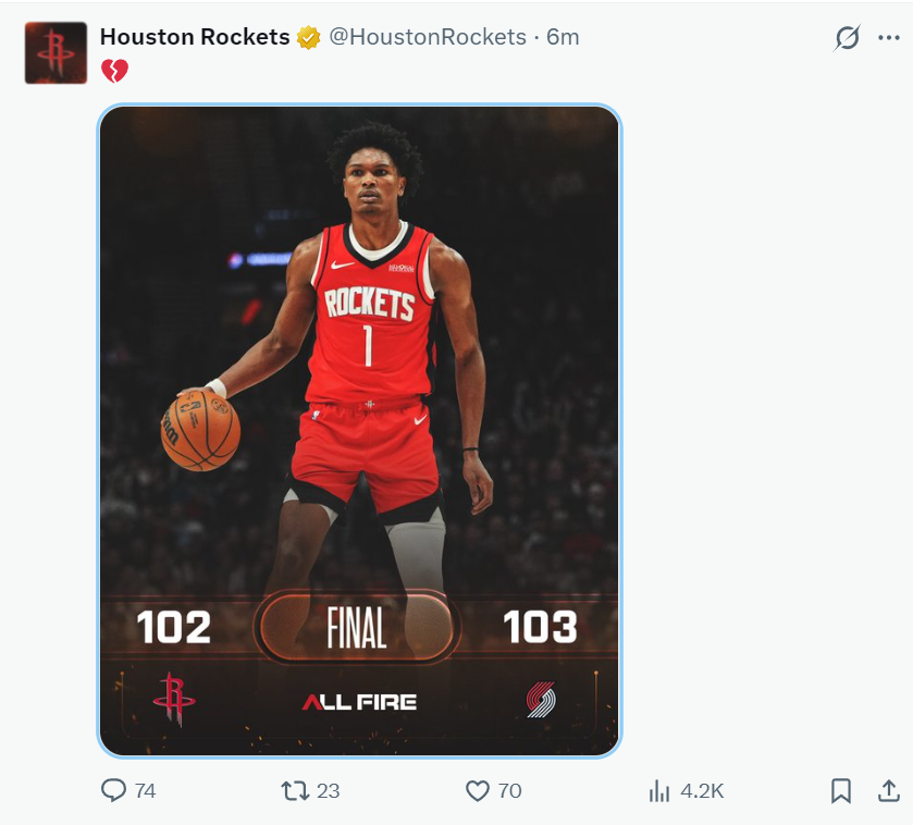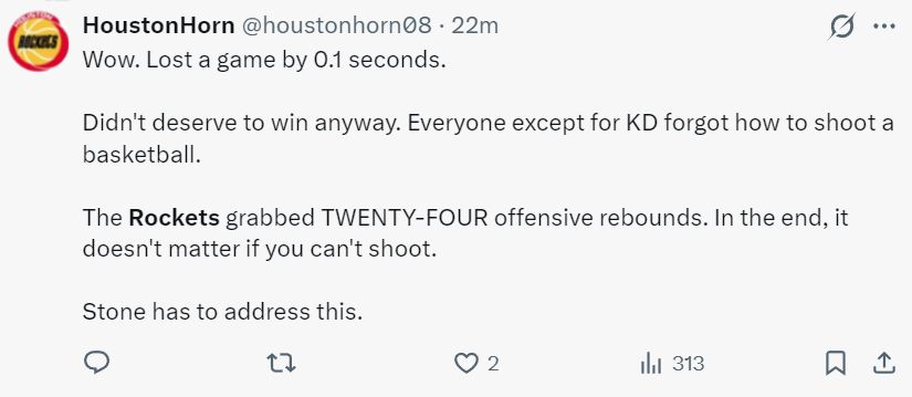 火箭队这场失利官方都非常心碎,杜兰特25中14高质高效的拿到35分4篮板,阿门命中率50%斩获23分13篮板6助攻1抢断2盖帽(但有一个关键的罚球丢了,如果两罚全中比赛就可以进入加时);