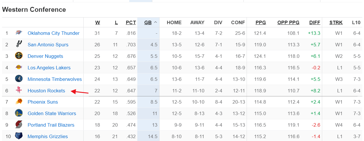 这场比赛后火箭直接从西部第四直落到西部第六,火箭与湖人都拉开0.5个胜场,没有约基奇的掘金接连击败凯尔特人、费城76人再度回到西部第三的位置。