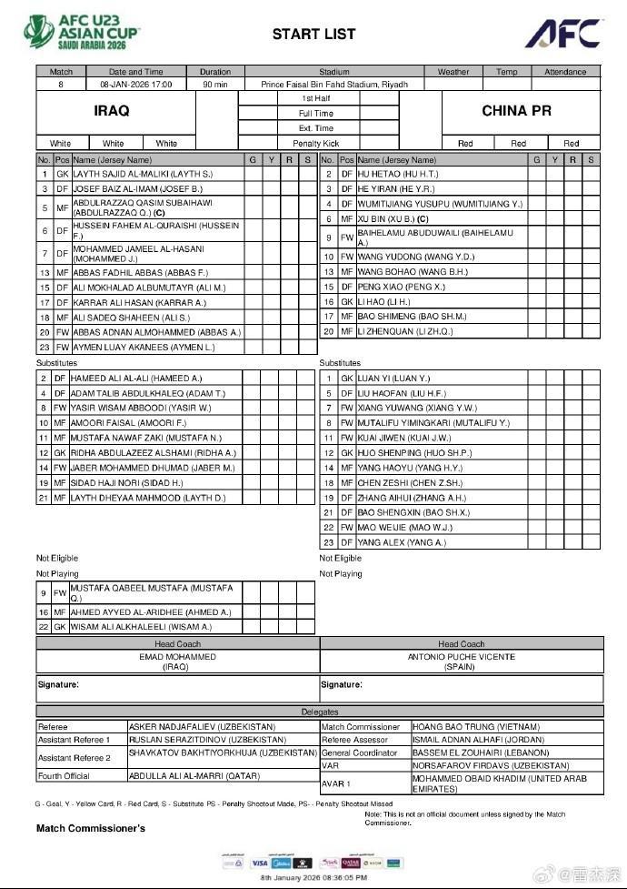北京时间1月8日,中国U23迎来U23亚洲杯首战。据记者王晓瑞消息,伊拉克U23还有两个主力不来了,今天上的第三门将。